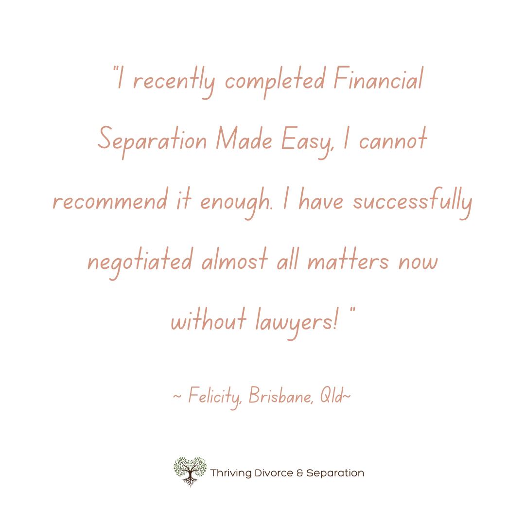 I am currently self-represented in the Court system for both property and parenting issues. It has been such an overwhelming process, but I recently had the opportunity to participate in Kara’s Financial Separation Made Easy program and I am so glad I did! Kara provides a step by step approach to navigating financial separation and for resolving areas of conflict in ways I had not considered. Her application of a conscious and holistic lens to the legal information and options gave me an entirely new perspective. I now feel fully equipped with all the information and resources I need to confidently self-represent in the Family Law system. I highly recommend Kara and her Financial Separation Made Easy program, it is well worth the investment!